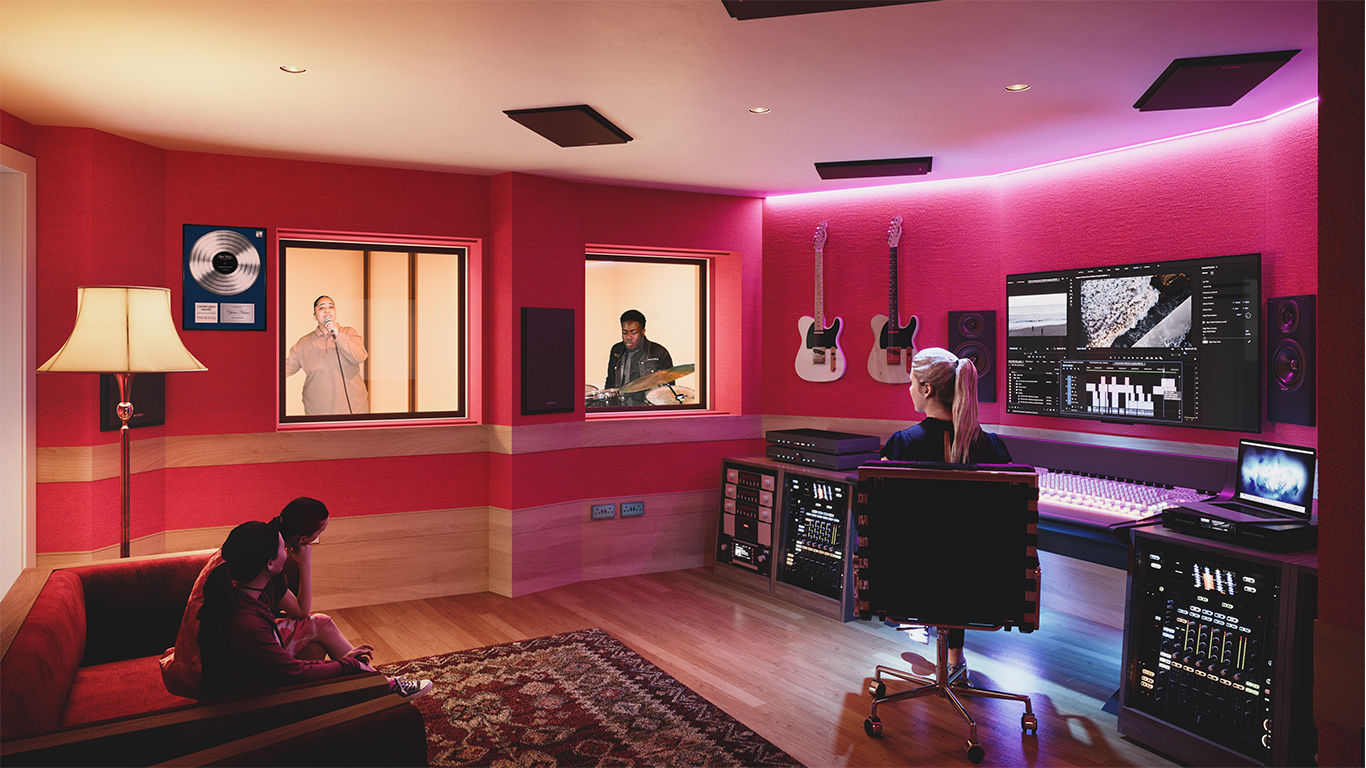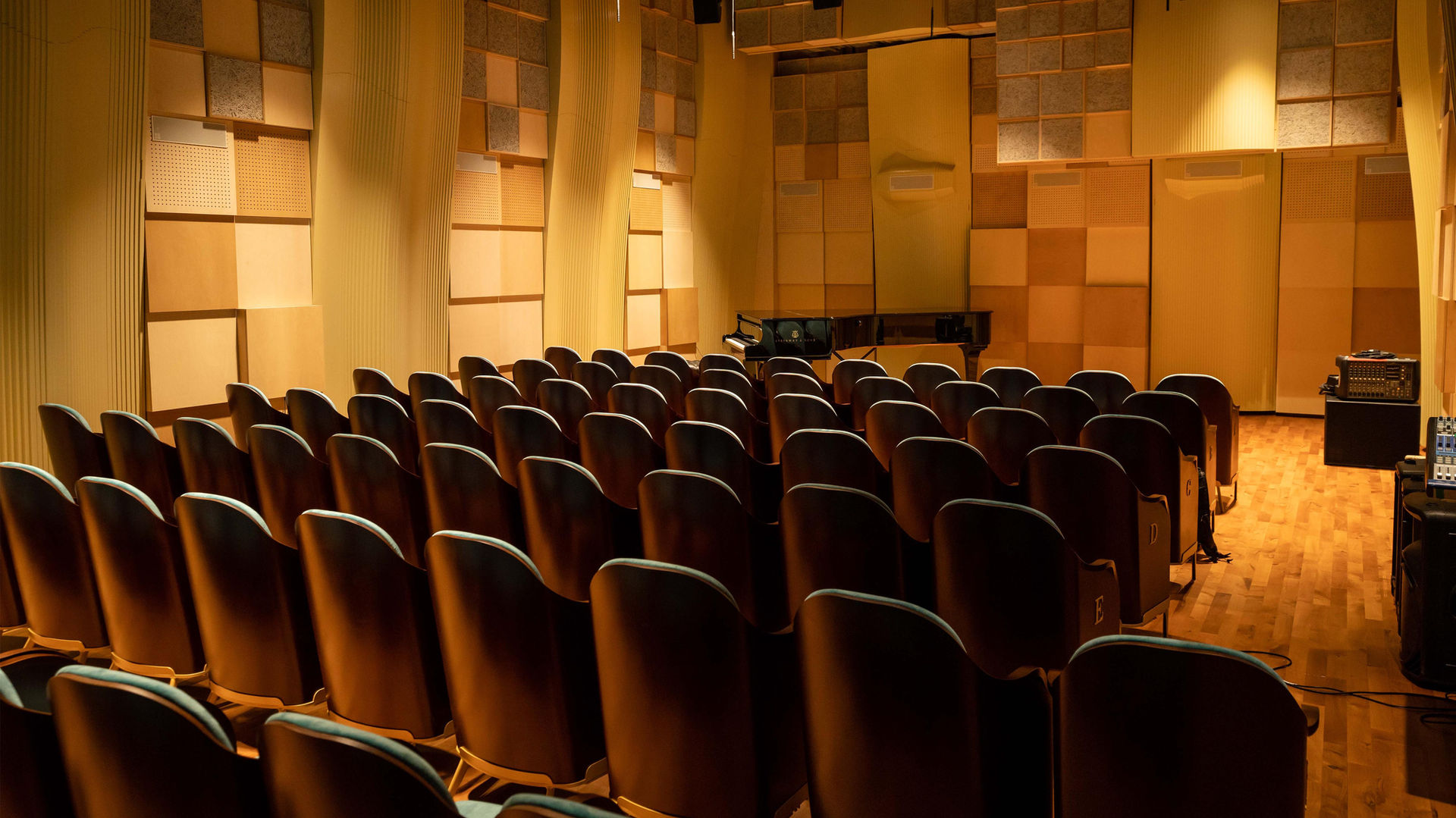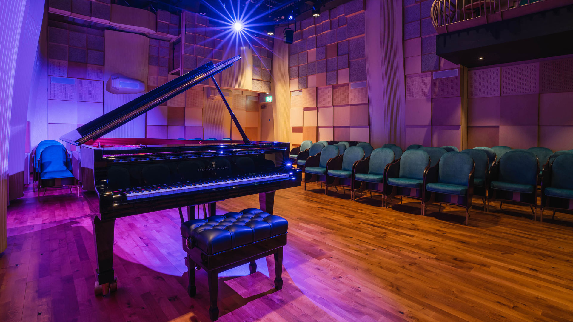This state of the art of venue, recording studio and teaching facility is located within the ground floor of a residential development at Embassy Gardens, Nine Elms, London. This context meant that acoustic isolation from the apartments above was paramount to the design brief for the project. The highly successful isolation is achieved by creating an inner box of building fabric that is separated from the rest of the building structural using isolated rubber connections to the slab and a completely independent wall and ceiling structure. The acoustic test results achieved with this separation far exceeded those predicted. The performance auditorium has multiple configurations including three different seating layouts, cabaret and a fully standing layout. This flexibility allows the venue to change capacity, allow recording, conferences, and creates varying stage positions giving artists and producers a greater choice over audience experience. The flexibility in stage position created acoustic design challenges as typically the stage position is fixed with reflective and absorptive surfaces are designed around this defined stage location. The challenge of dealing with the this was with through embedding the d&b Soundscape system into the space. This system allows sounds made within the space to be captured and then relayed back to the audience through a sequence of different speakers some integrated into the walls and others hung off the pipe grid above. The two primary features of this technology as described by d&b are;